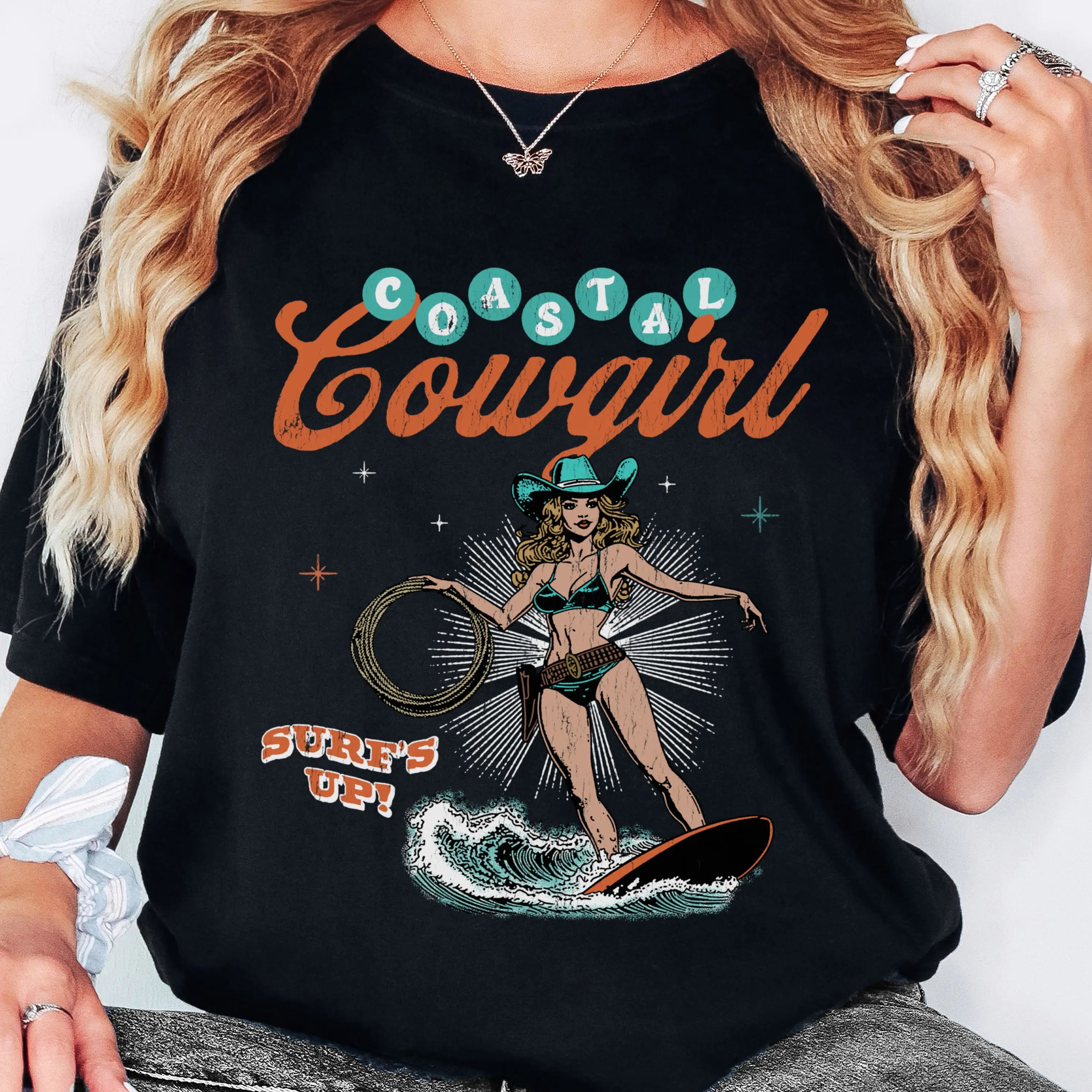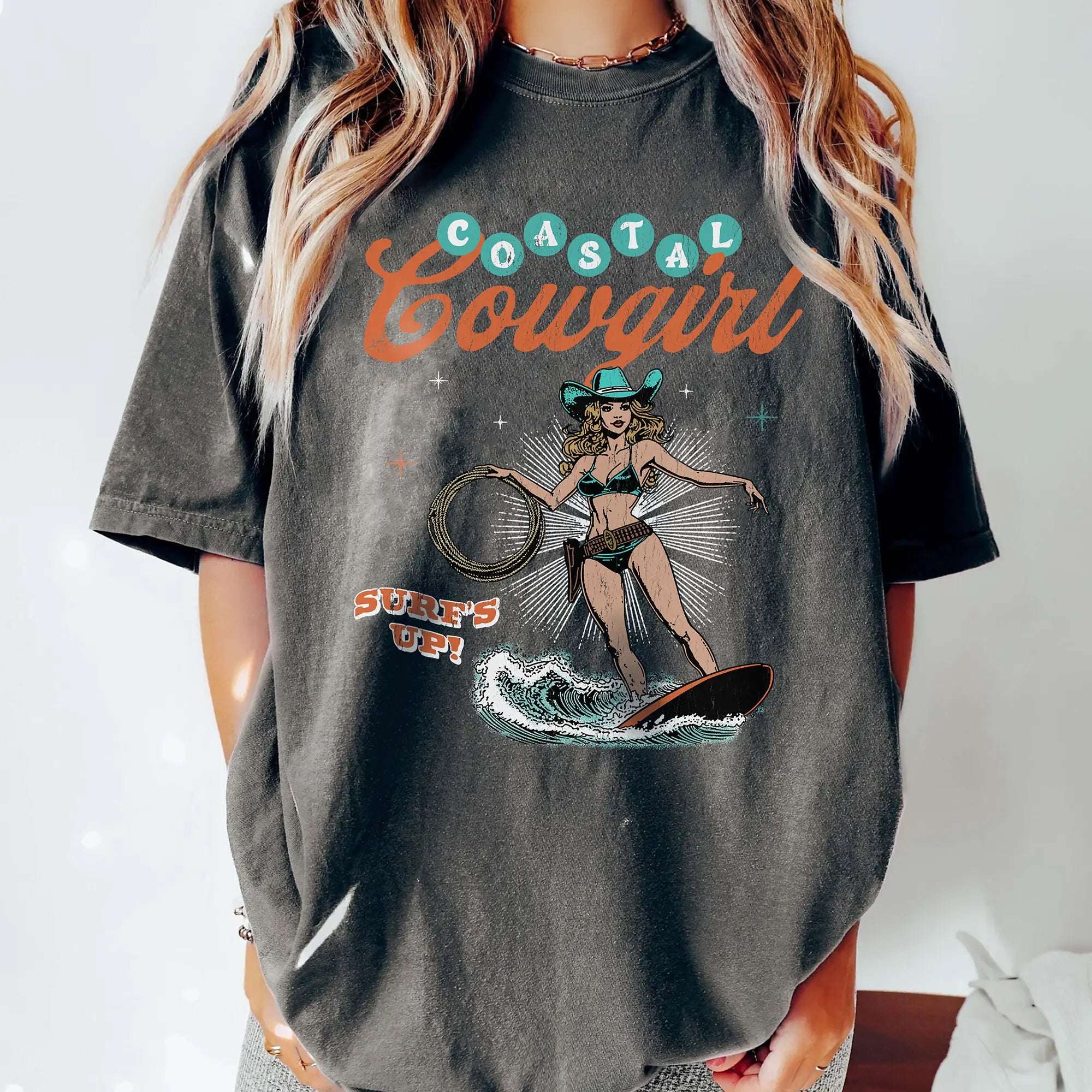 Say hello to the wild side of the West with our Coastal Cowgirl Premium Tee. This bold and breezy design features a fearless cowgirl in a bikini catching a wave like a pro. With a looped rope in hand, a trusty gun holster on her hip, and “Surf’s Up” scrawled in the corner, she’s the perfect mashup of seaside vibes and Western grit. Printed on a super-soft, high-quality Comfort Colors tee, it’s made for those who roam the coast and the range. Whether you're beach-bound or boot-stompin’, this shirt turns heads and rides high on style.