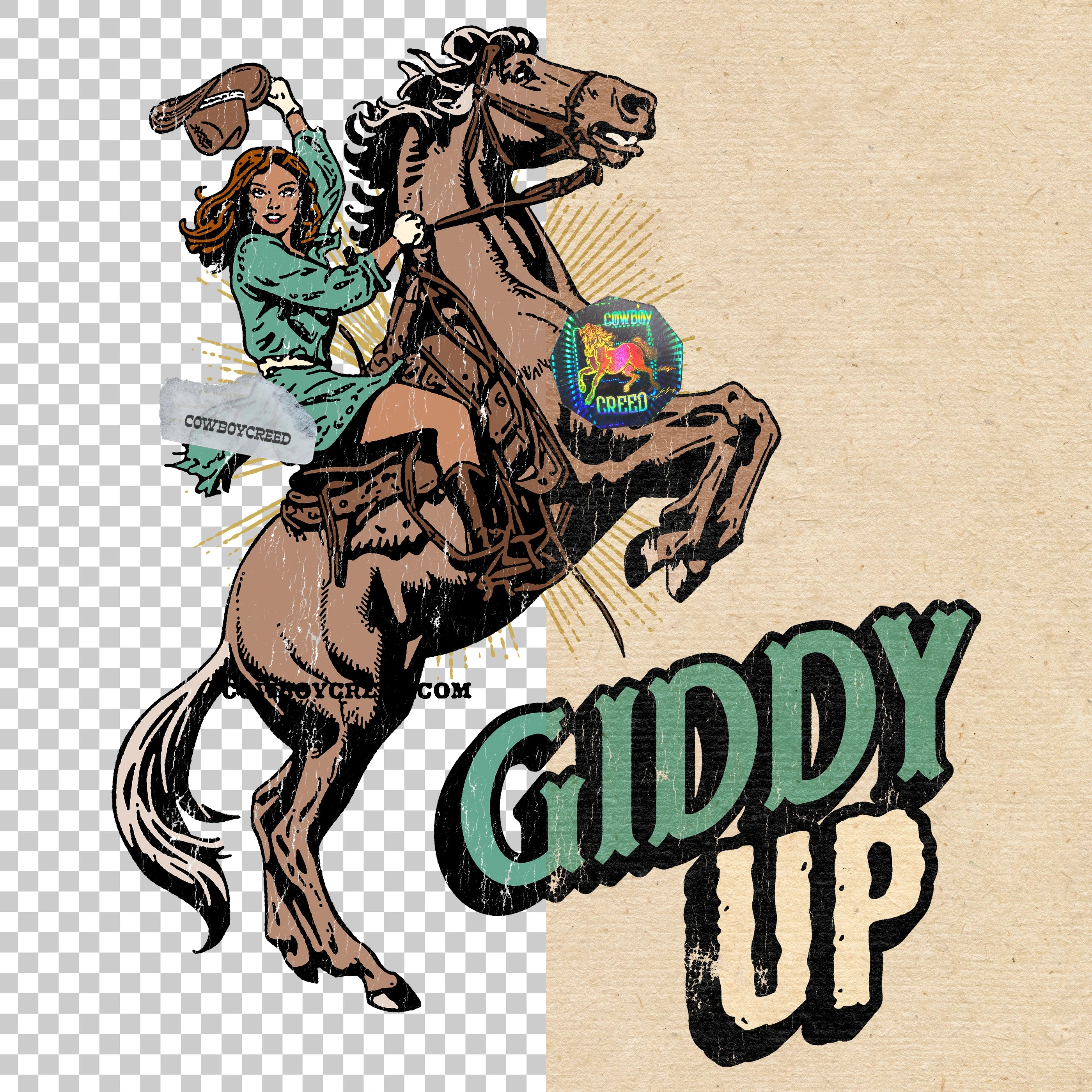 Introducing an exceptional piece of artwork that's sure to ignite your creativity! Giddy Up is now available for digital download, offering a meticulously crafted illustration that captures the essence of cowgirls in the American Wild West. Whether you're a graphic designer, entrepreneur, or simply a lover of Vintage Western art, this will enhance your projects or your décor.