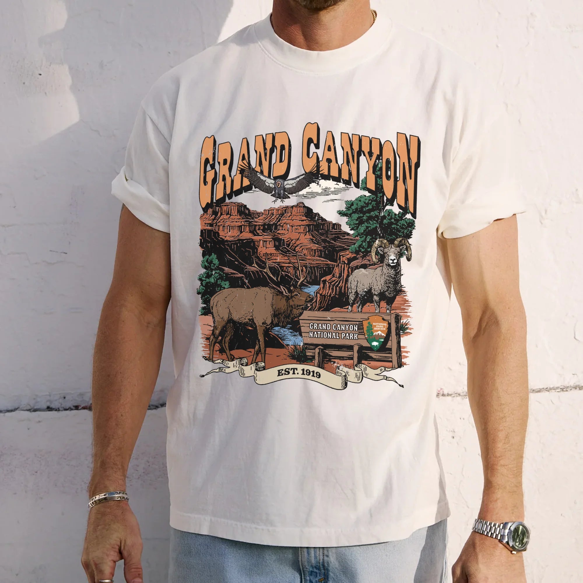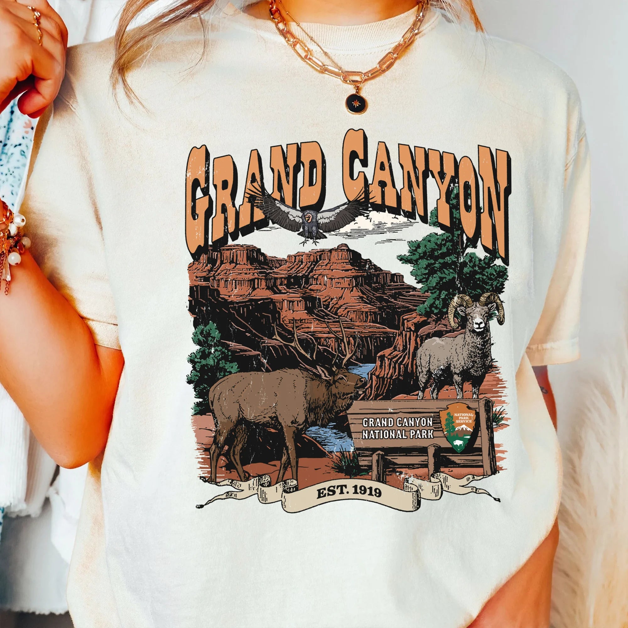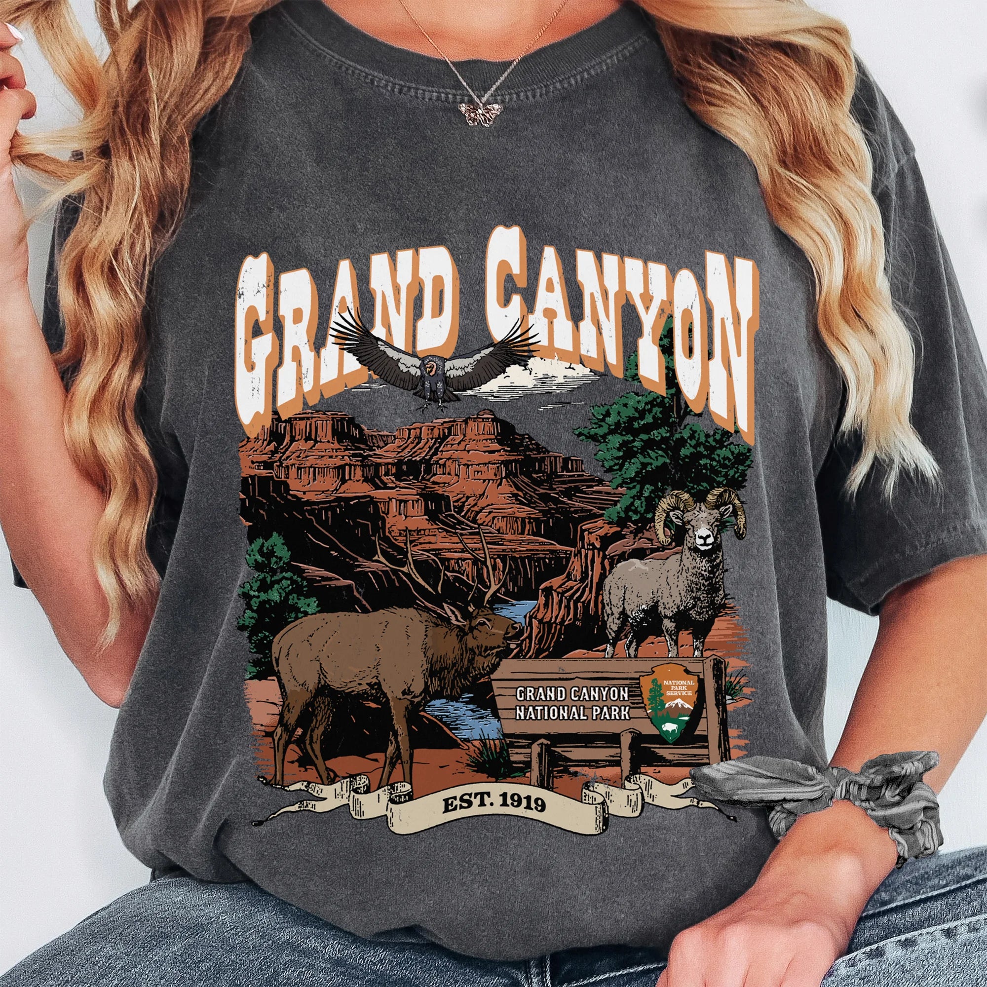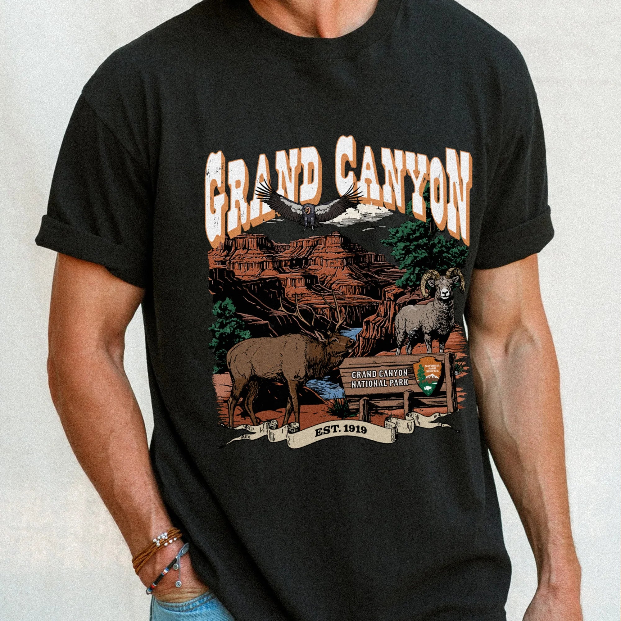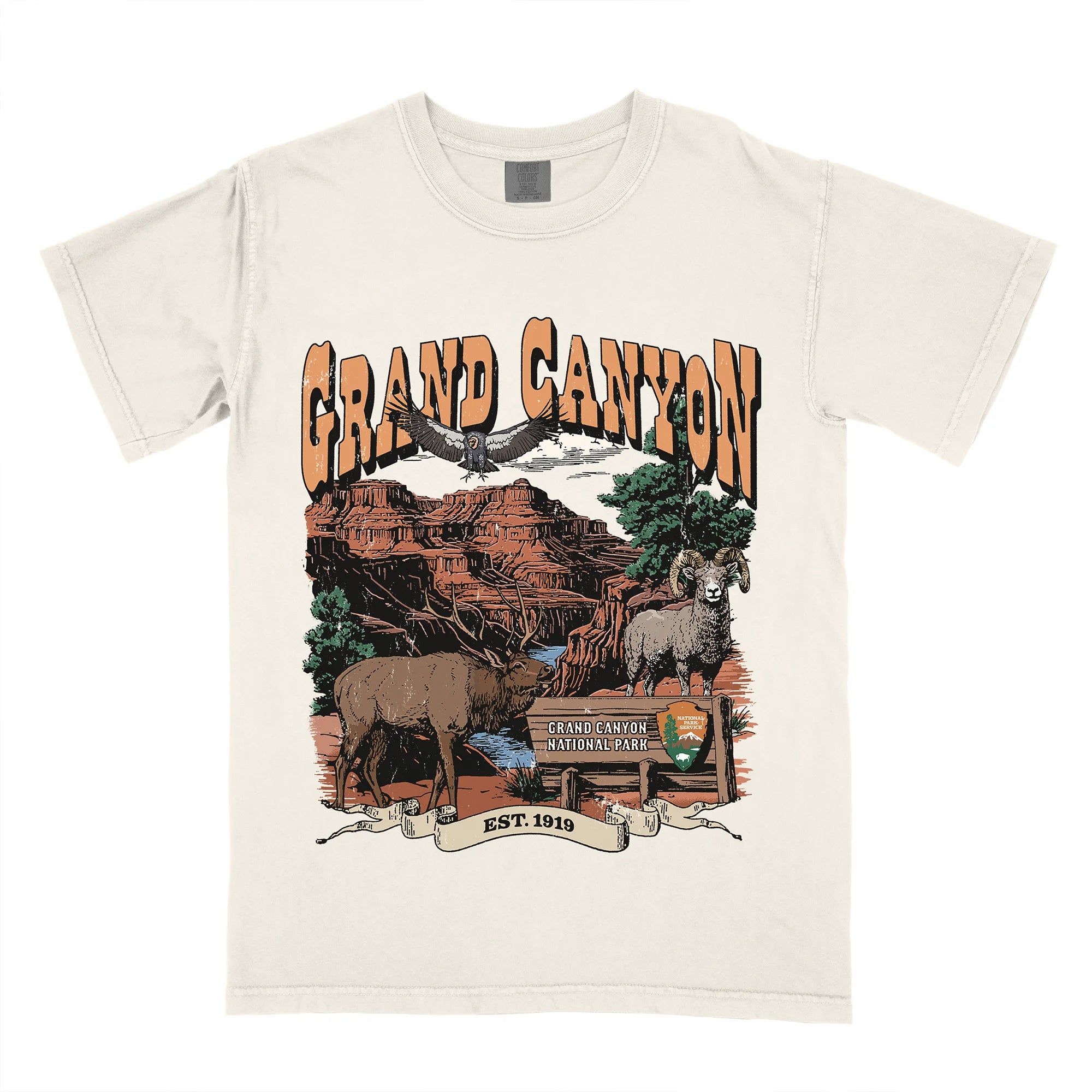 The design captures the rugged majesty of the Grand Canyon's iconic red cliffs beneath a desert sunset, with a bighorn sheep, flanked by an elk, a condor in flight, and the official park sign. The classic Western-style typography and “EST. 1919” ribbon ground this piece in American heritage and wilderness spirit.