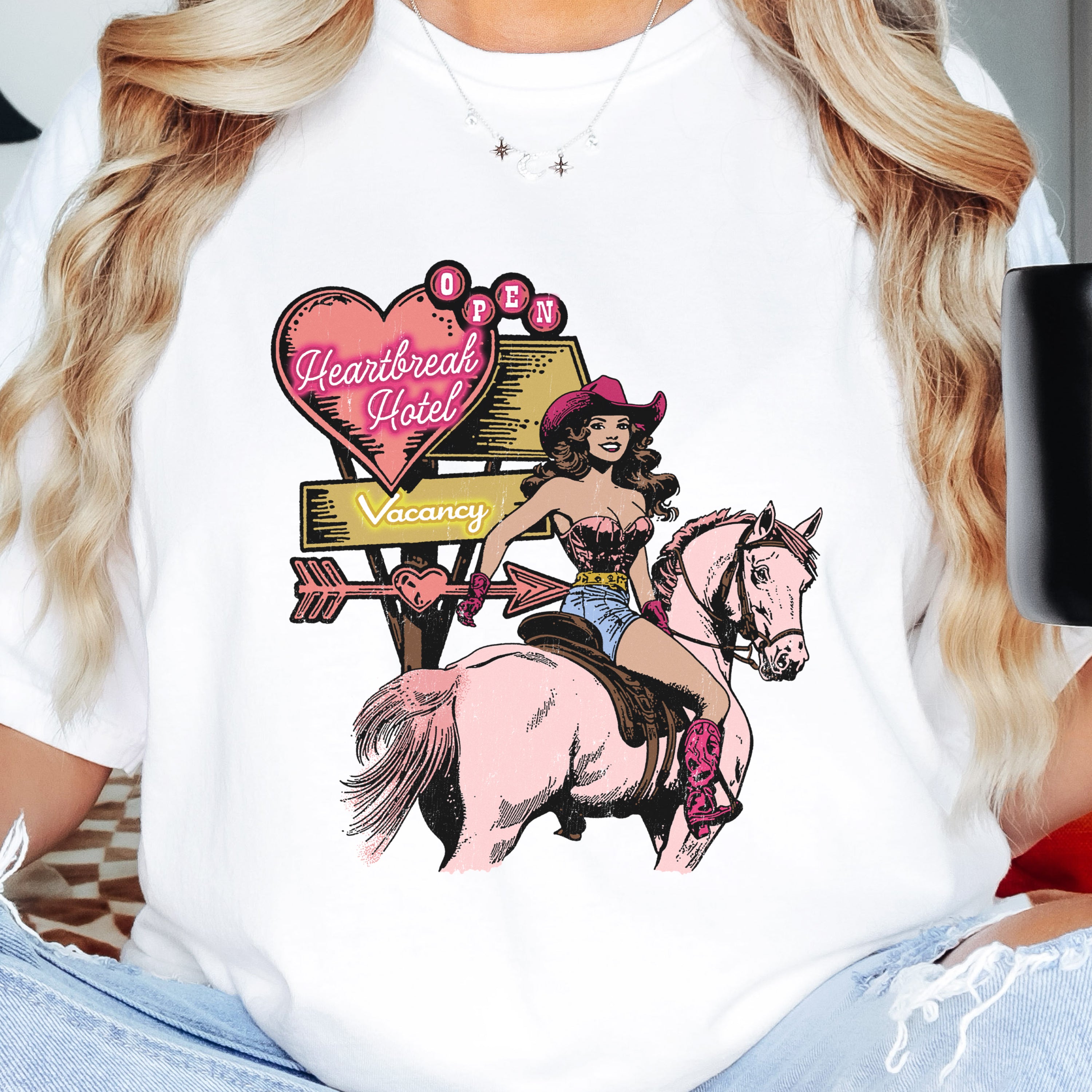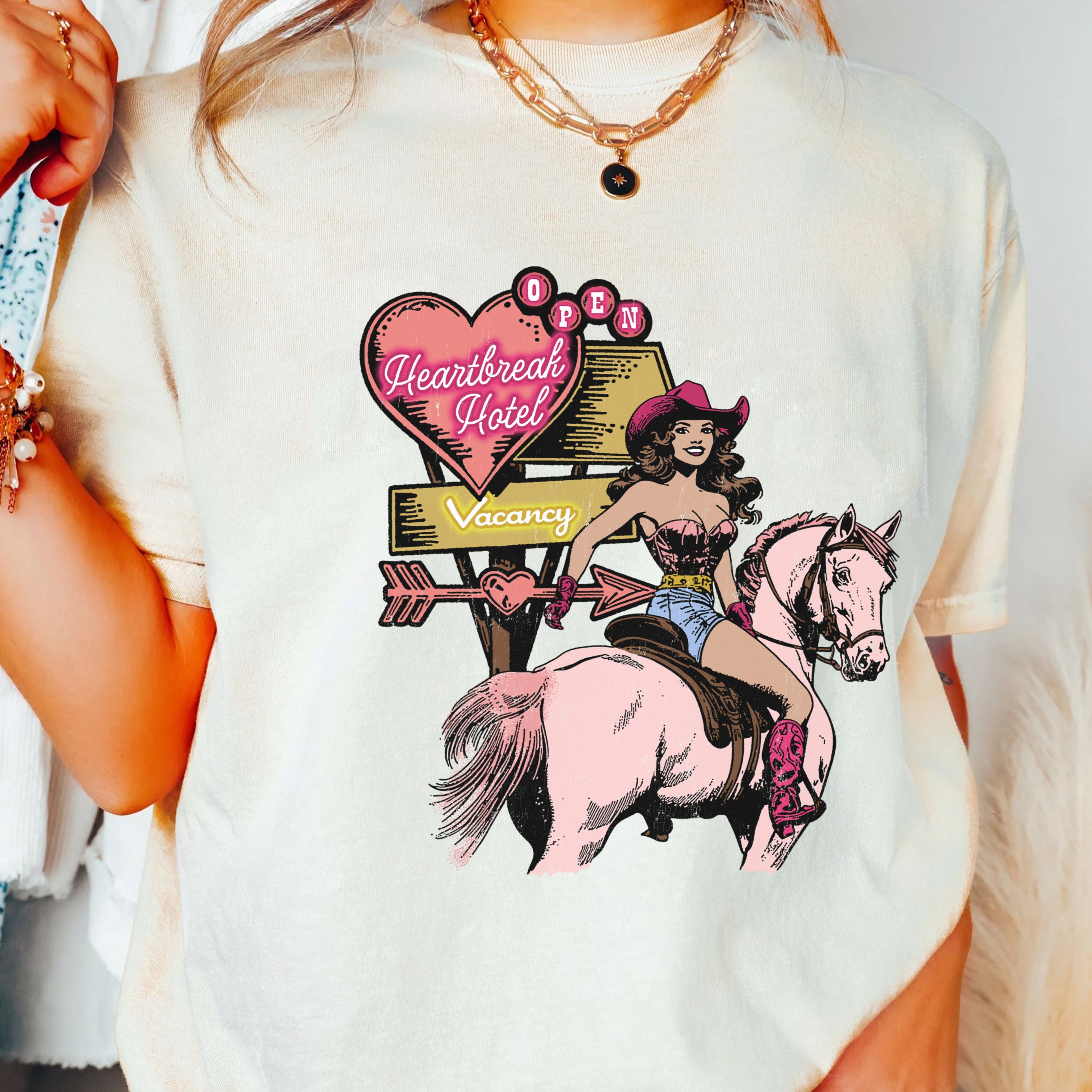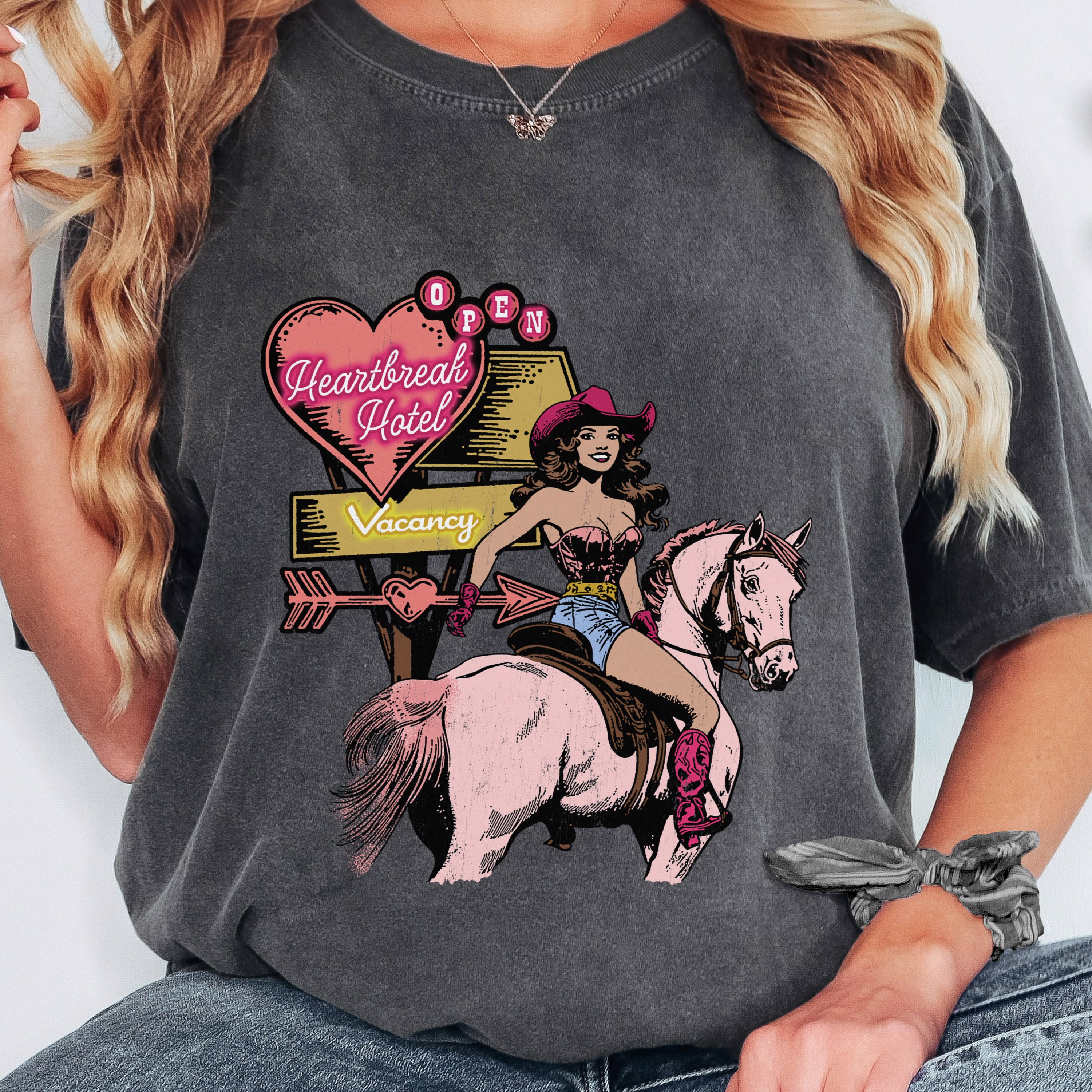 Check into the Heartbreak Hotel with this one-of-a-kind premium tee. Featuring a bold cowgirl riding a light pink horse, this... Read more