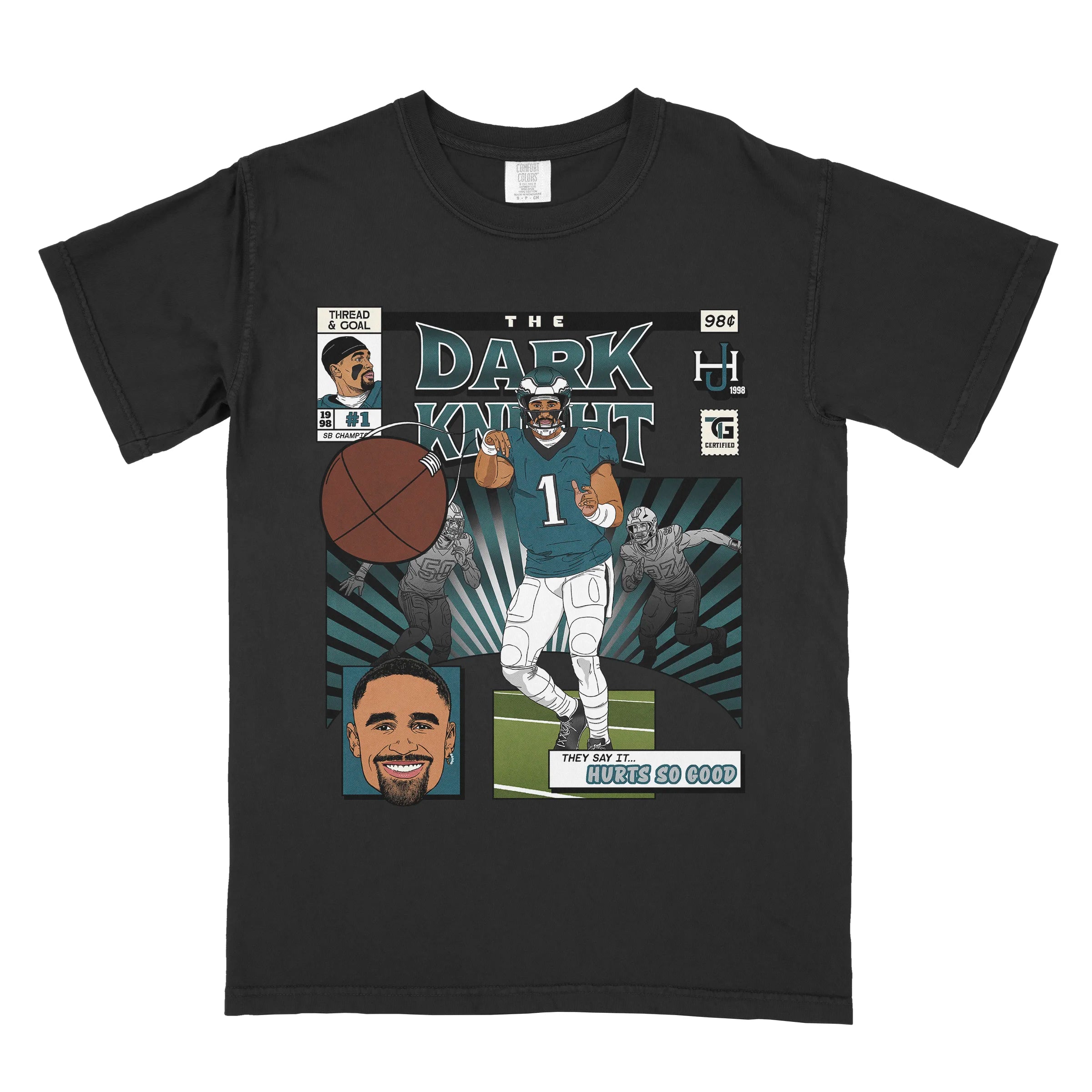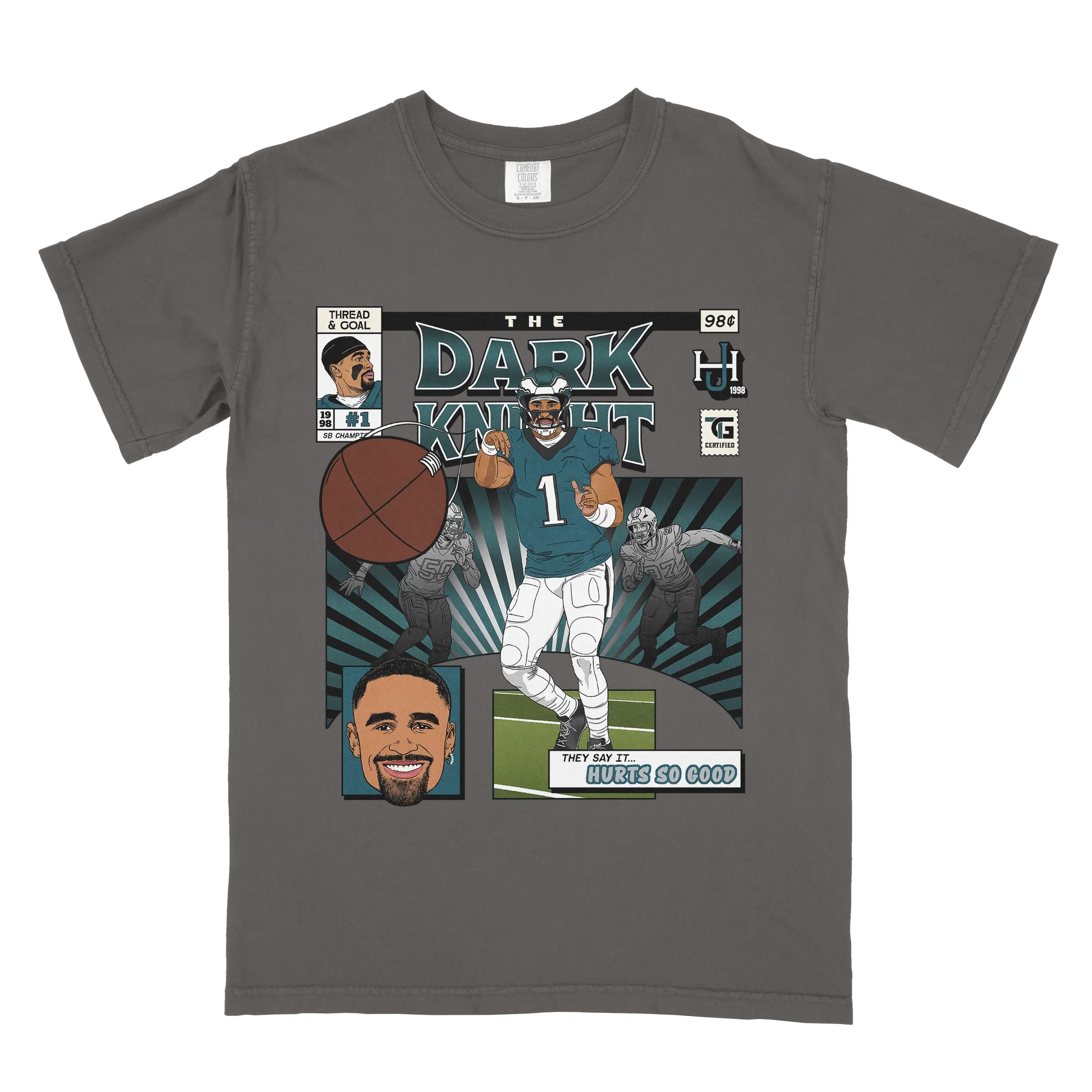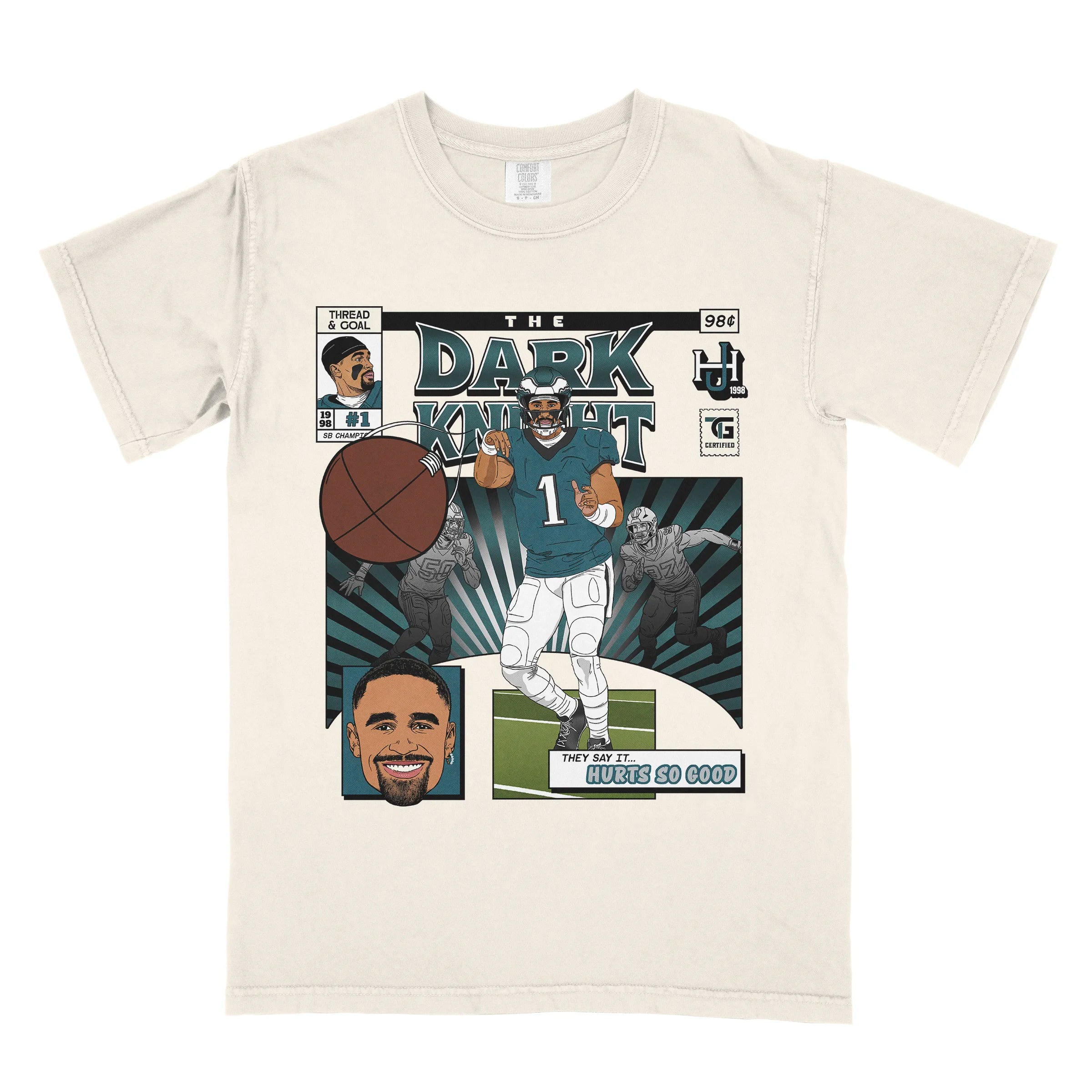 You will be READY for game day with our standout Hurts Comic Book tee! It's the perfect mix of vintage comfort and bold, spirited design. Made from 100% ring-spun cotton and garment-dyed for a super soft, broken-in feel, this unisex relaxed fit shirt offers a laid-back vibe that's as comfortable as it is stylish. The artwork is a vibrant depiction of Jalen as he lasers a pass to a receiver, celebrating one of the league's most iconic quarterbacks. It's a premium Comfort Colors® brand tee that's built to last season after season.