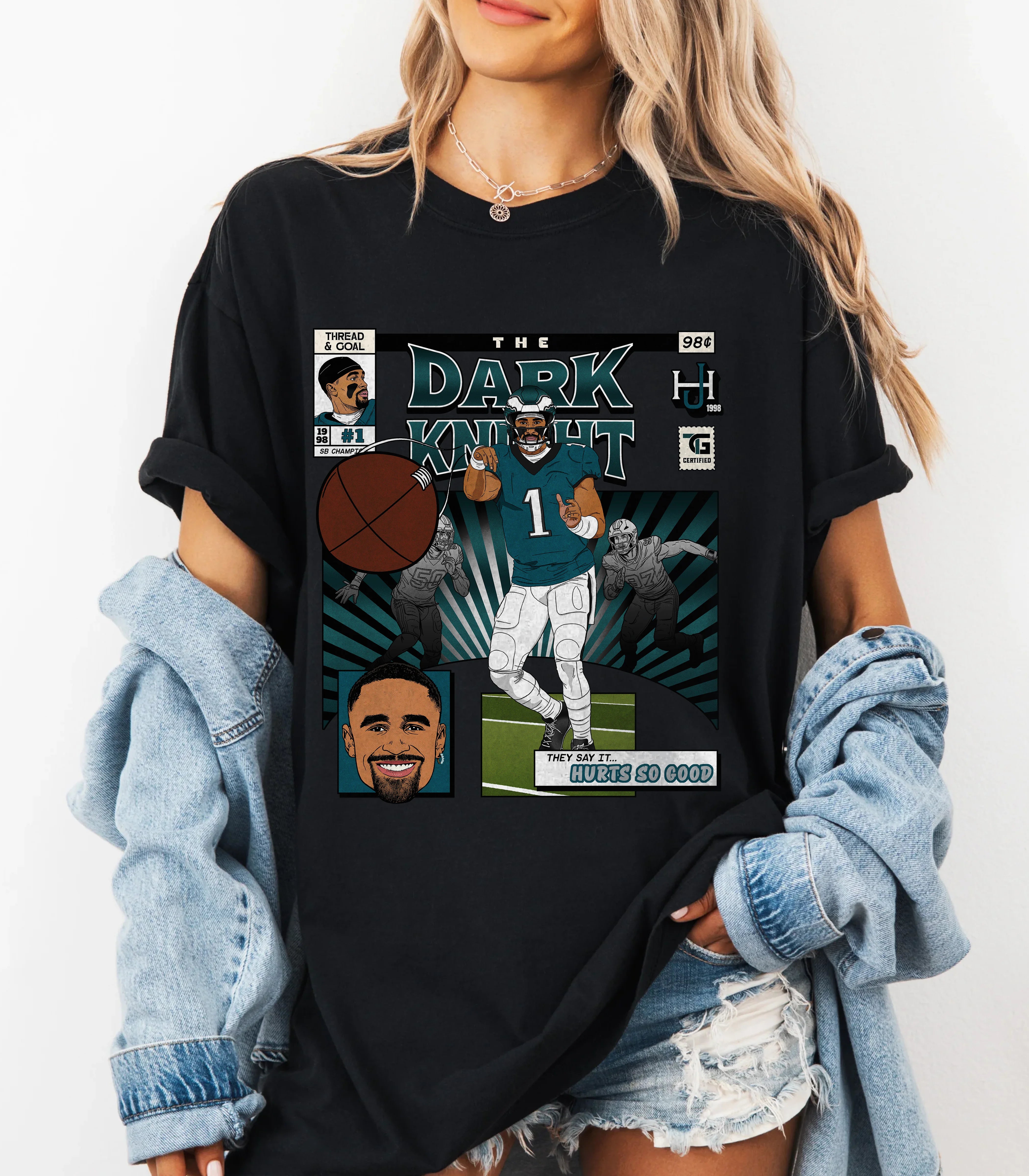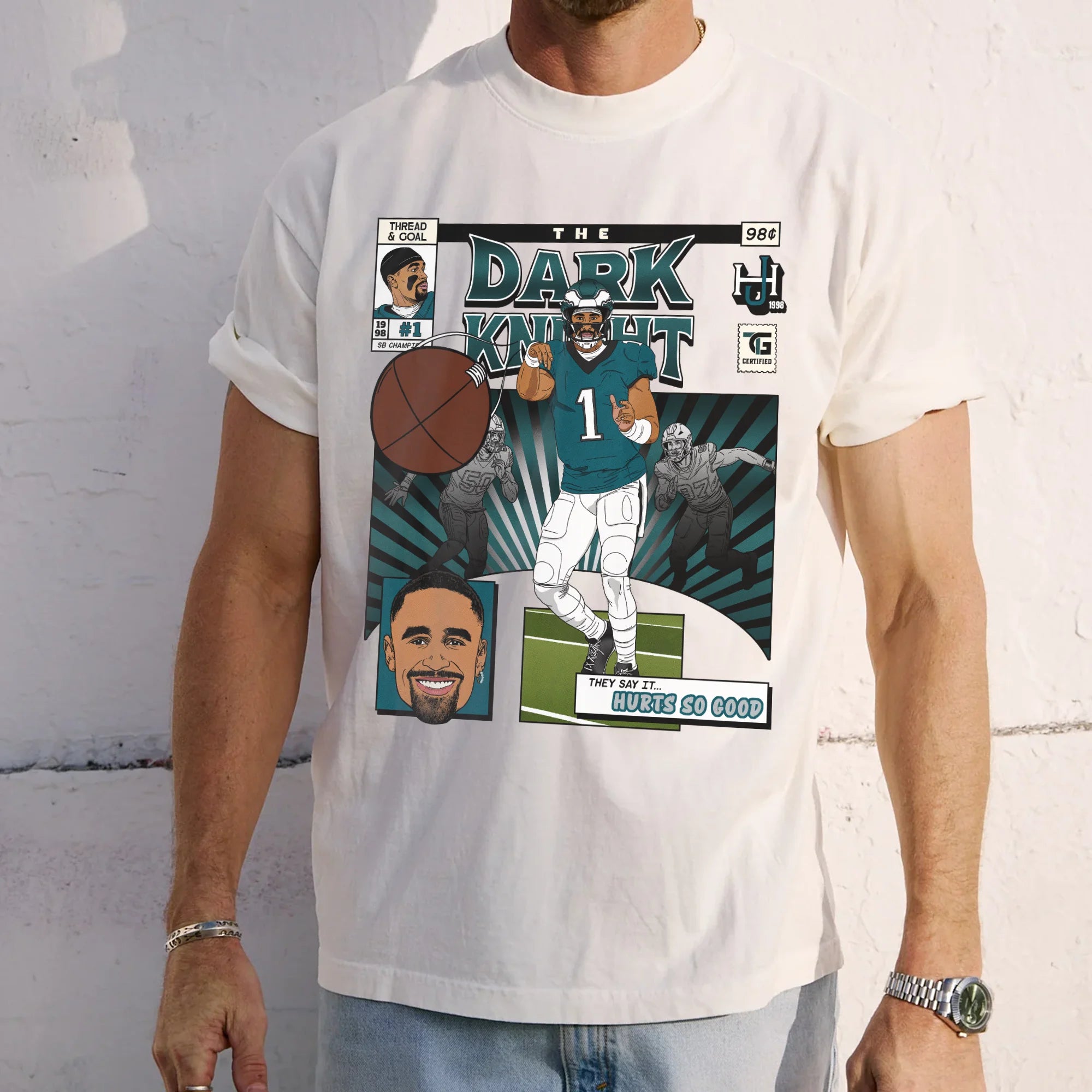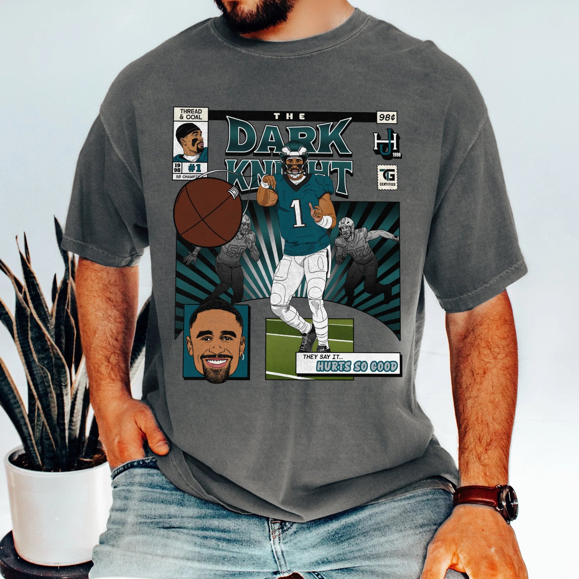 You will be READY for game day with our standout Hurts Comic Book tee! It's the perfect mix of vintage comfort and bold, spirited design. Made from 100% ring-spun cotton and garment-dyed for a super soft, broken-in feel, this unisex relaxed fit shirt offers a laid-back vibe that's as comfortable as it is stylish. The artwork is a vibrant depiction of Jalen as he lasers a pass to a receiver, celebrating one of the league's most iconic quarterbacks. It's a premium Comfort Colors® brand tee that's built to last season after season.