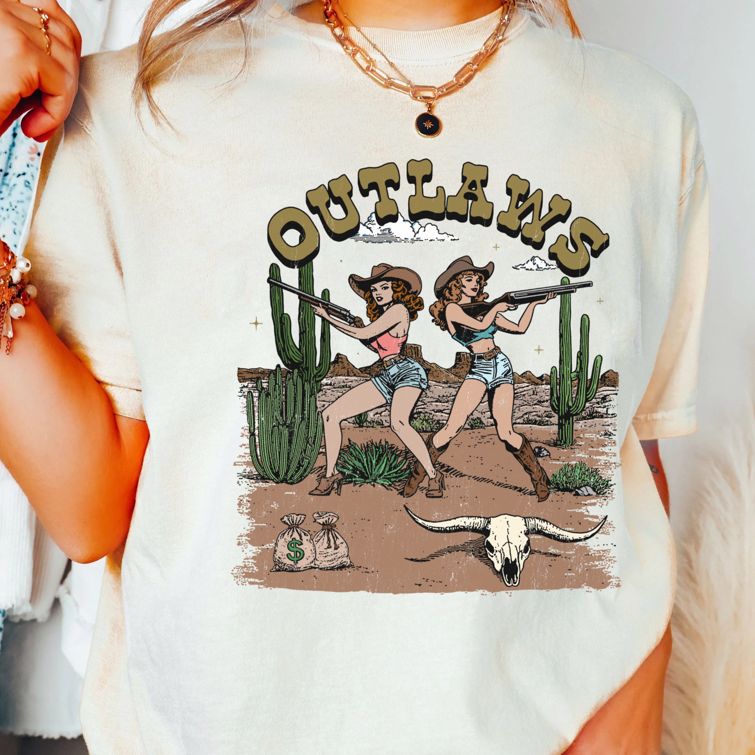 Ride or die in the Outlaws Premium Tee — a bold tribute to the wild-hearted and the fearless. Featuring two tough-as-nails cowgirls standing back-to-back, rifles in hand, this design sets the scene in a rugged desert full of towering cacti, sun-bleached sand, and a lone bull skull watching over the loot. Two bags of cash lie at their feet, hinting at a heist well done. Printed on ultra-soft, high-quality fabric, this tee is for those who live by their own rules and look damn good doing it.