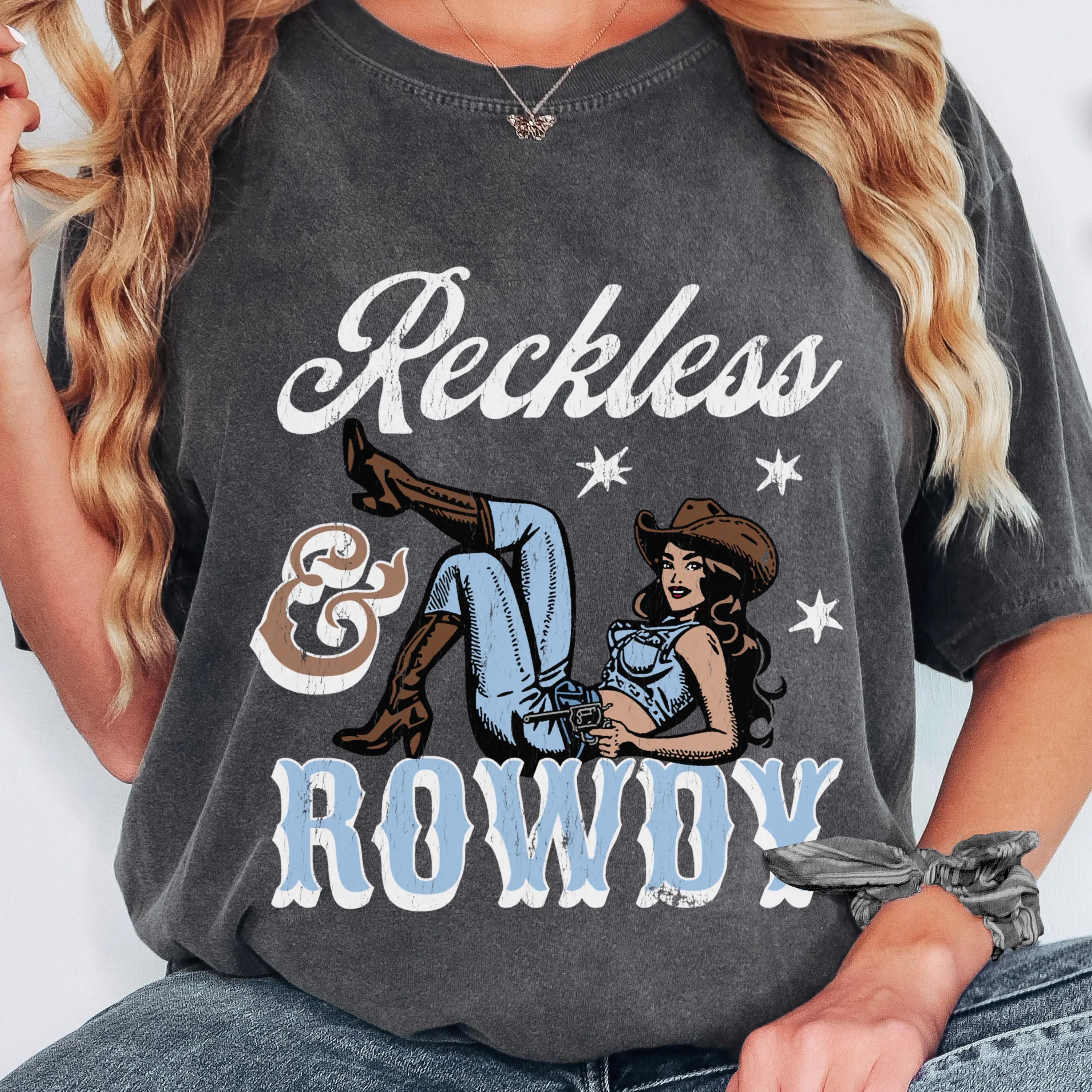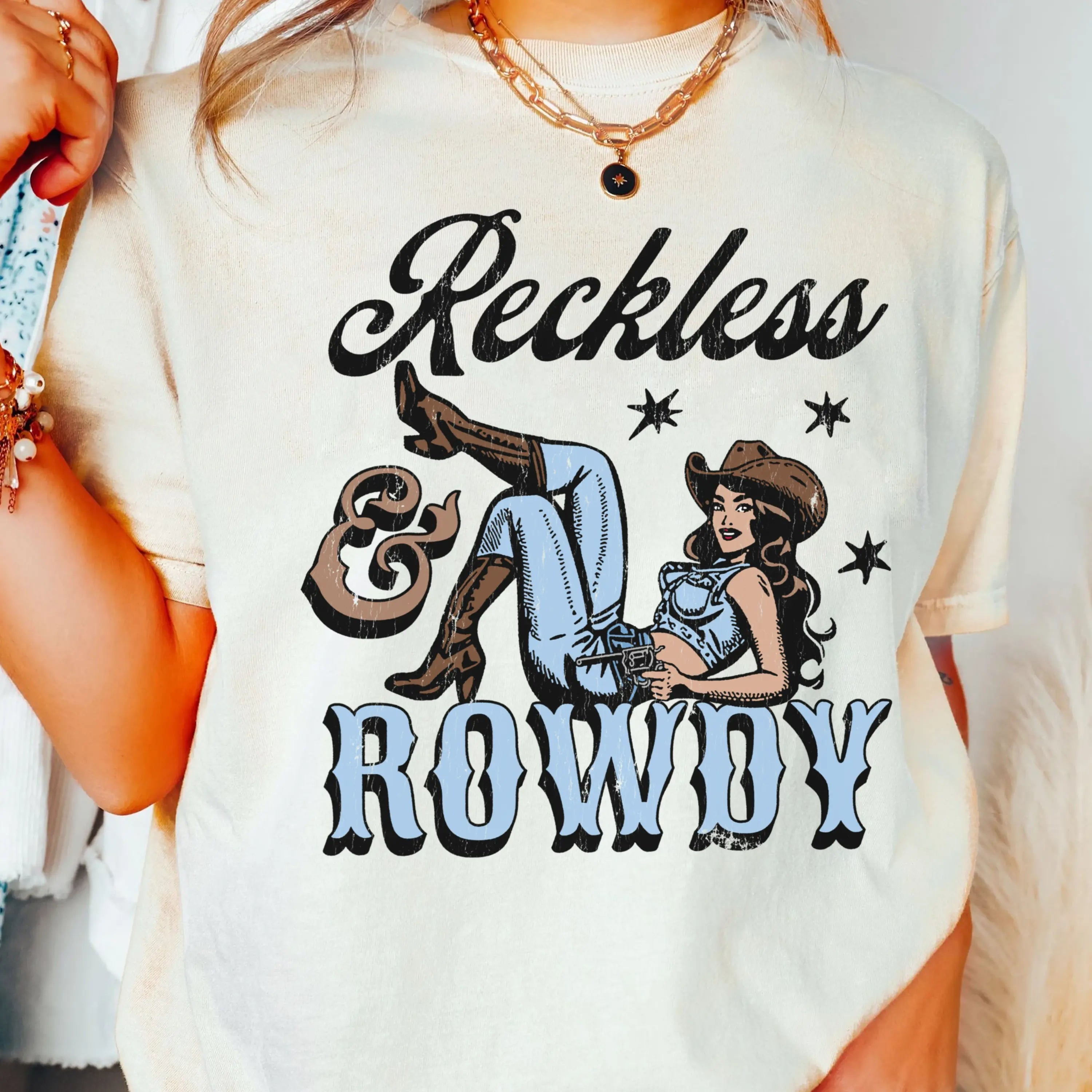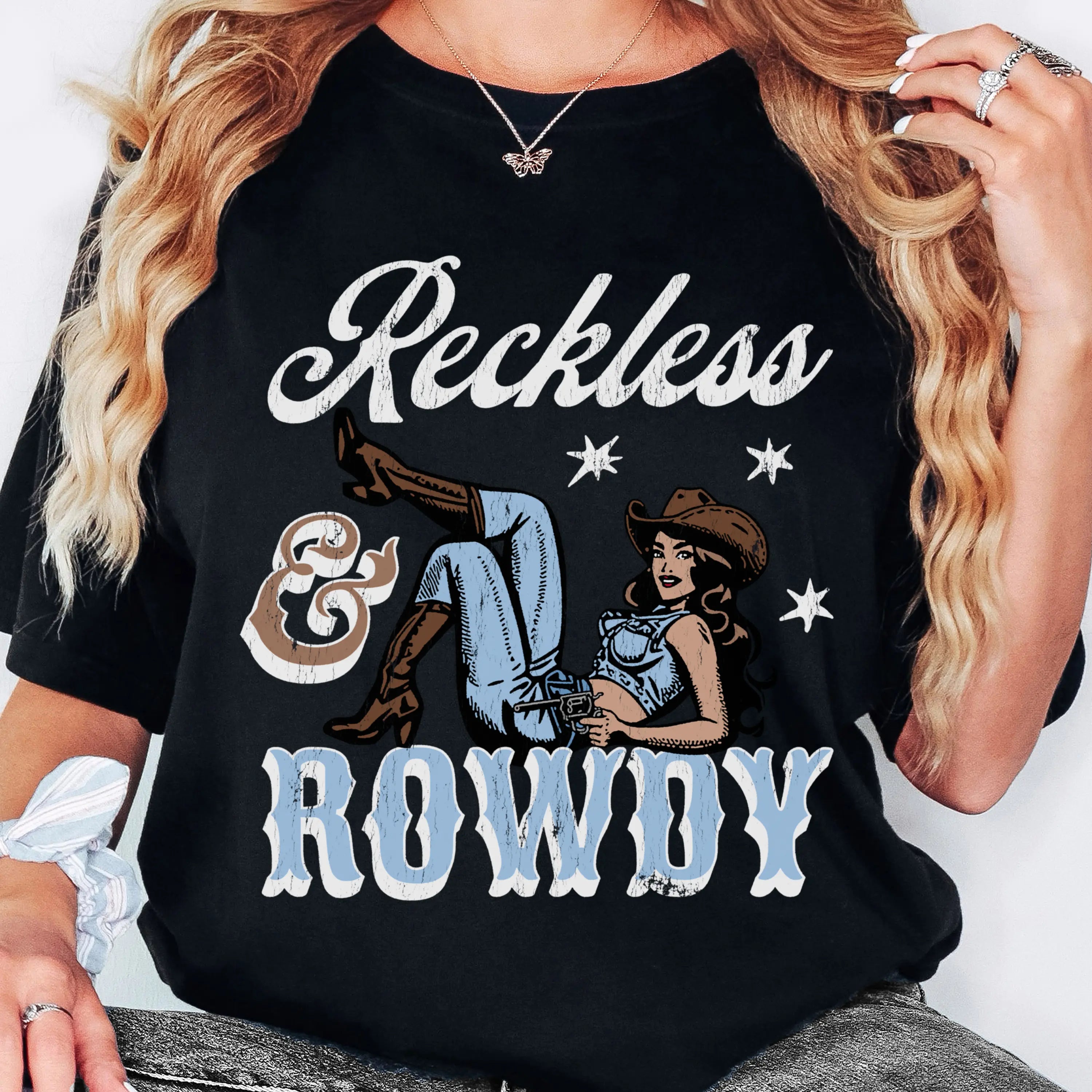 Meet your new favorite statement piece: the Reckless & Rowdy Premium Tee. This design brings the heat with a carefree cowgirl kicking back on her elbows, legs crossed, flashing a sly smile as she casually aims her revolver. Decked out in a cowgirl hat, denim vest, and classic jeans, she’s the perfect mix of charm and chaos. It’s western grit with a playful twist—printed on buttery-soft premium fabric for a perfect fit and feel. Whether you’re raising hell or laying low, this tee was made for wild hearts and untamed souls.