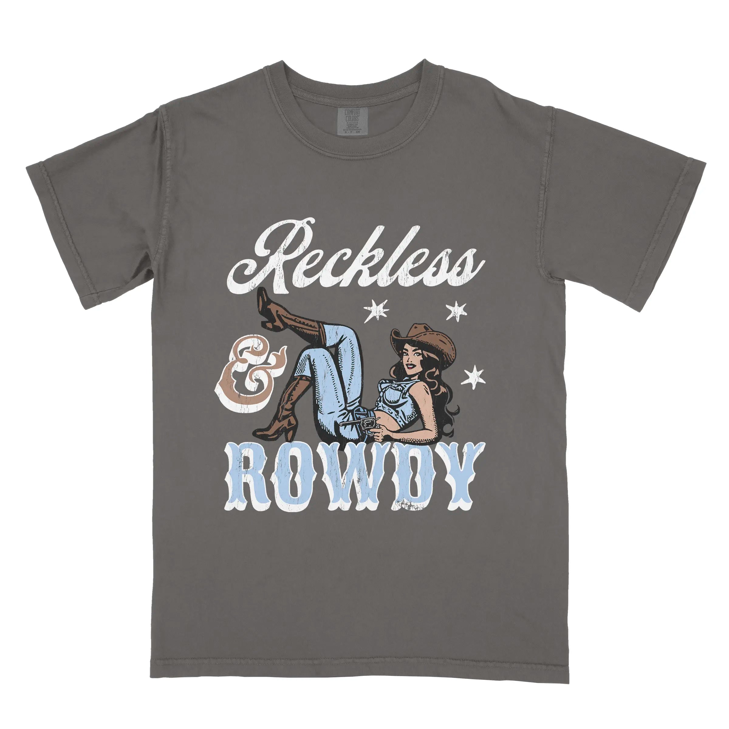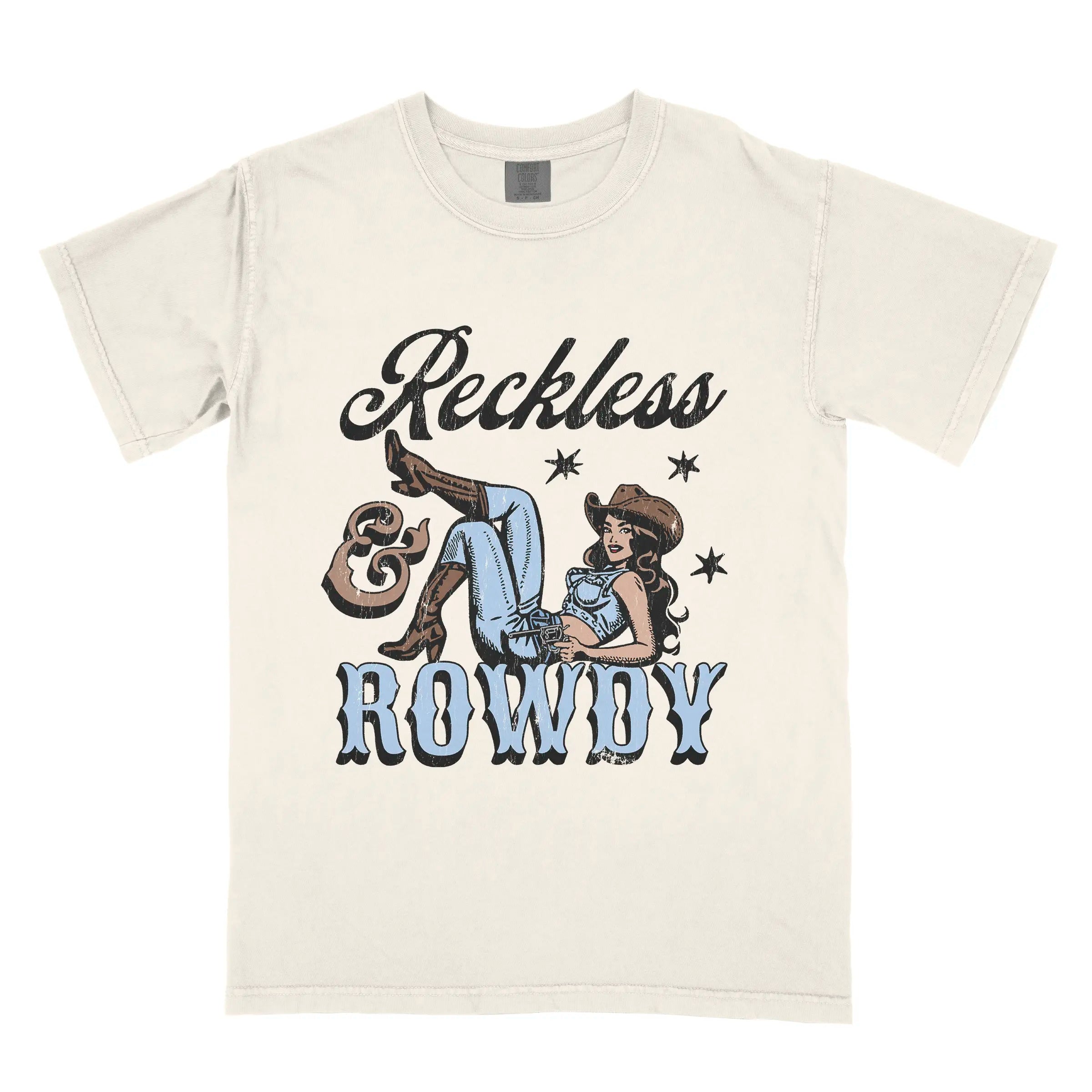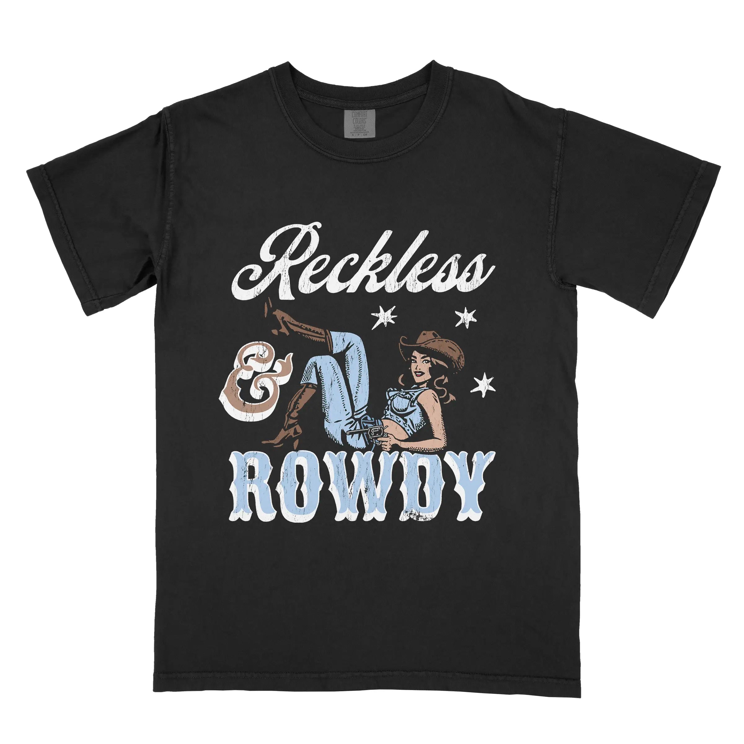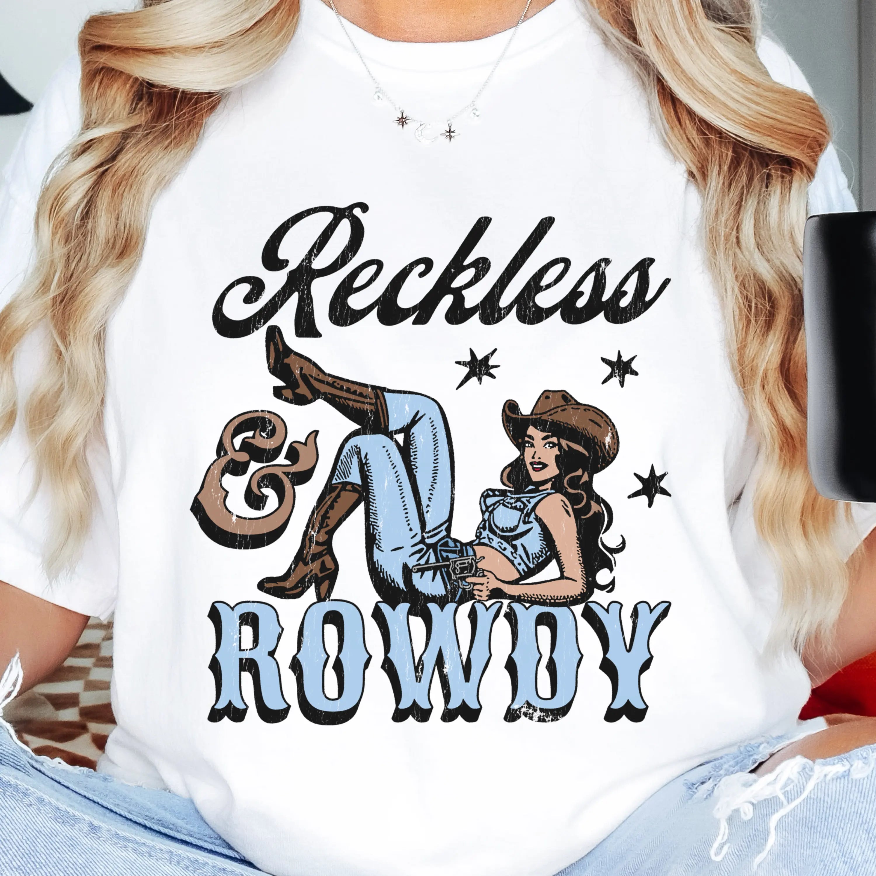 Meet your new favorite statement piece: the Reckless & Rowdy Premium Tee. This design brings the heat with a carefree cowgirl kicking back on her elbows, legs crossed, flashing a sly smile as she casually aims her revolver. Decked out in a cowgirl hat, denim vest, and classic jeans, she’s the perfect mix of charm and chaos. It’s western grit with a playful twist—printed on buttery-soft premium fabric for a perfect fit and feel. Whether you’re raising hell or laying low, this tee was made for wild hearts and untamed souls.